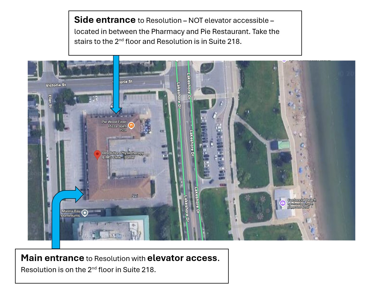 While our clinic's windows overlook Centennial Park on picturesque Kempenfelt Bay, entrances to our office are on the side or the back of the building, facing away from the water. See the image below for a depiction of how you can find our entrances. Parking is free. Resolution Physiotherapy is on the 2nd floor in Suite 218.